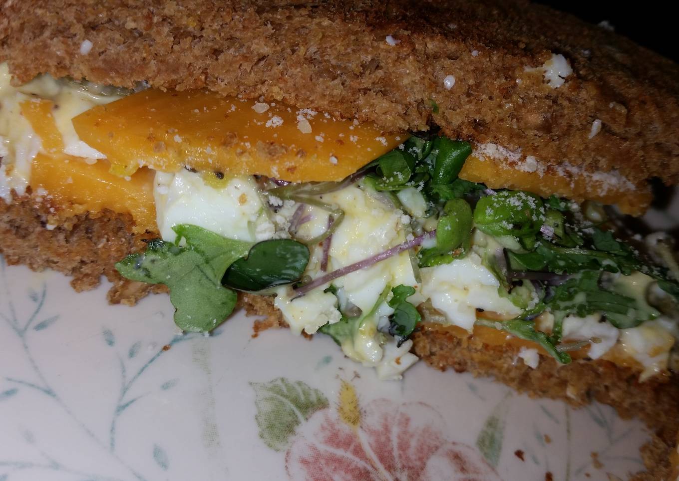 - Put a dollop or two of egg salad mixture on top of the cheese, then add bunch of sprouts