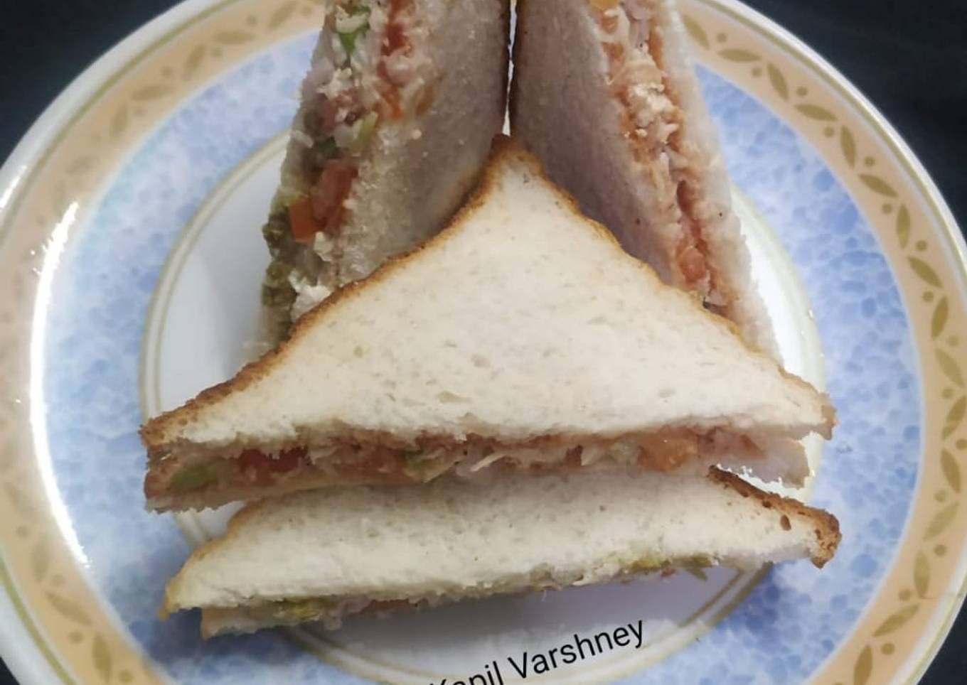- Now spread mayonnaise stuffing on one of the slices. Cover with the other slice and gently press to make a sandwich. Cut into a triangle shape.