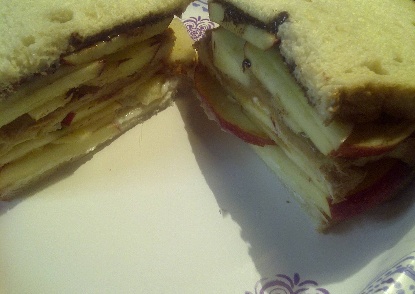 - Add the rest of the apple slices on the peanut butter. On the third slice of bread, add Nutella.