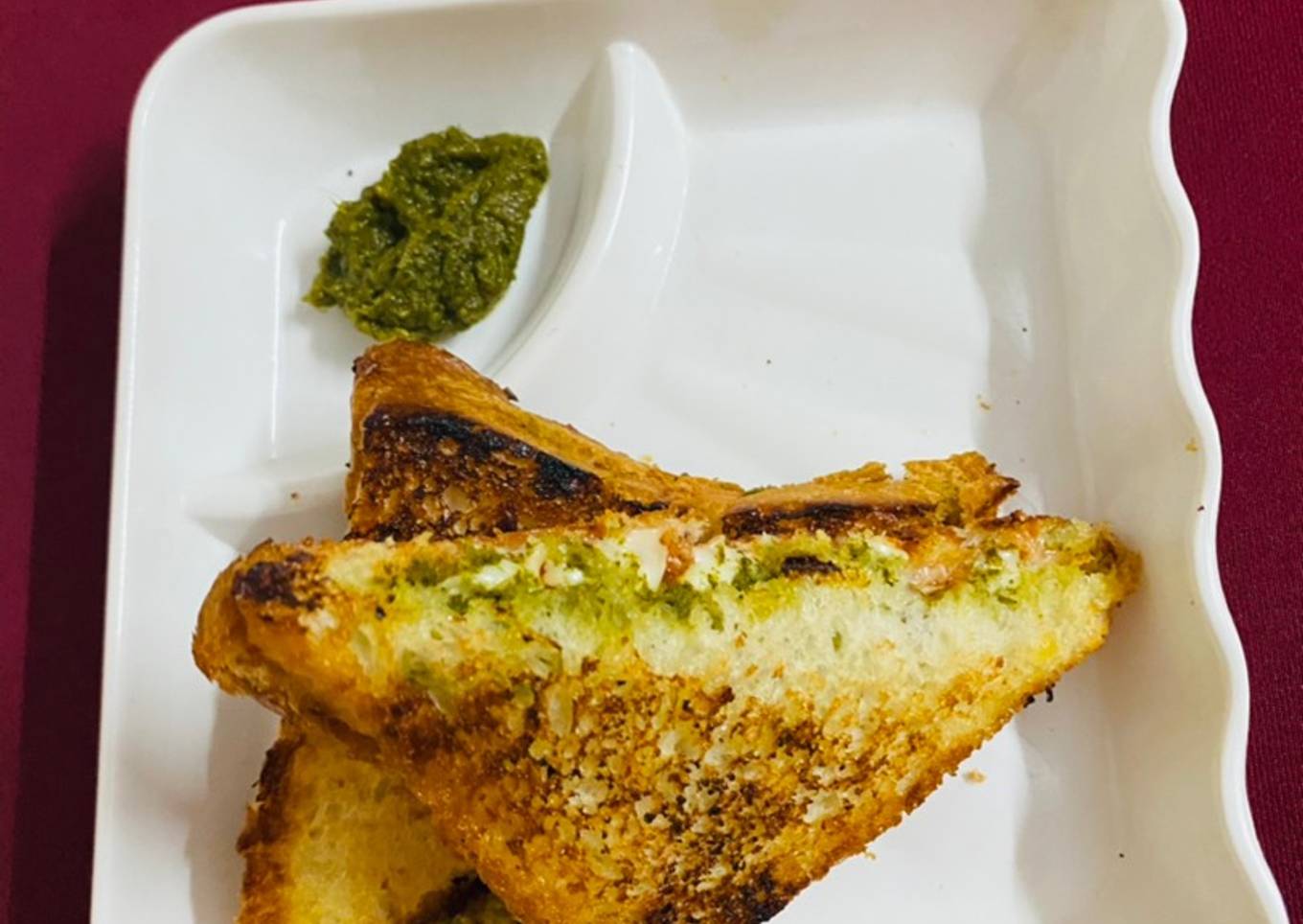 - Take two bread slices. On one slice spread green chutney.